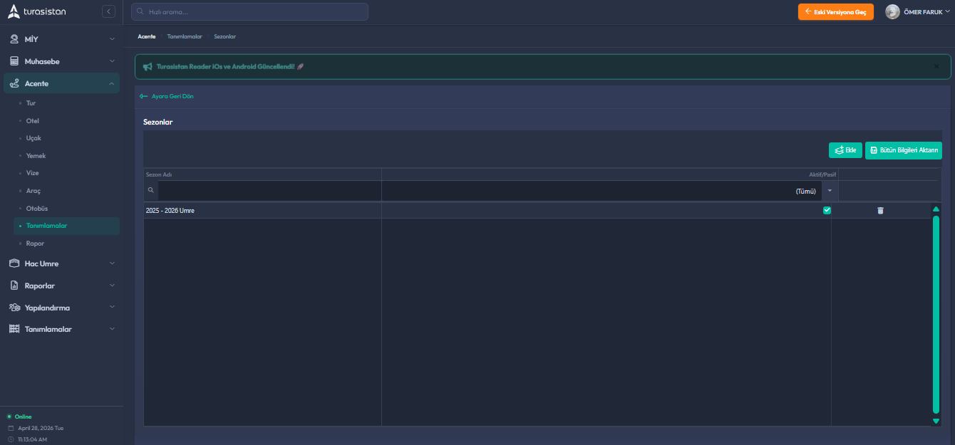 ACENTE/TANIMLAMALAR/SEZONLAR