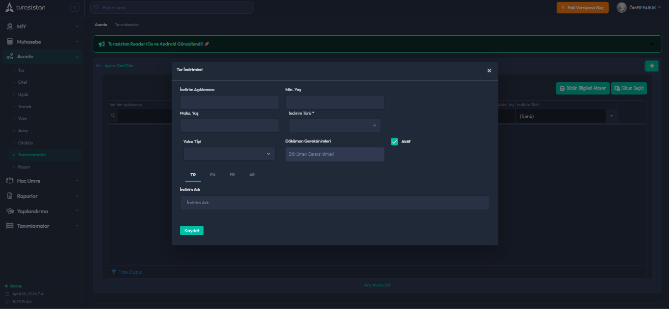 ACENTE/TANIMLAMALAR/TUR İNDİRİMLERİ