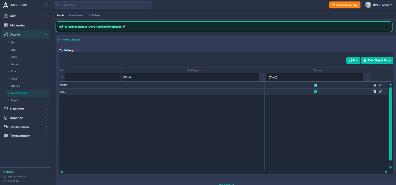 ACENTE/TANIMLAMALAR/TUR KATEGORİ