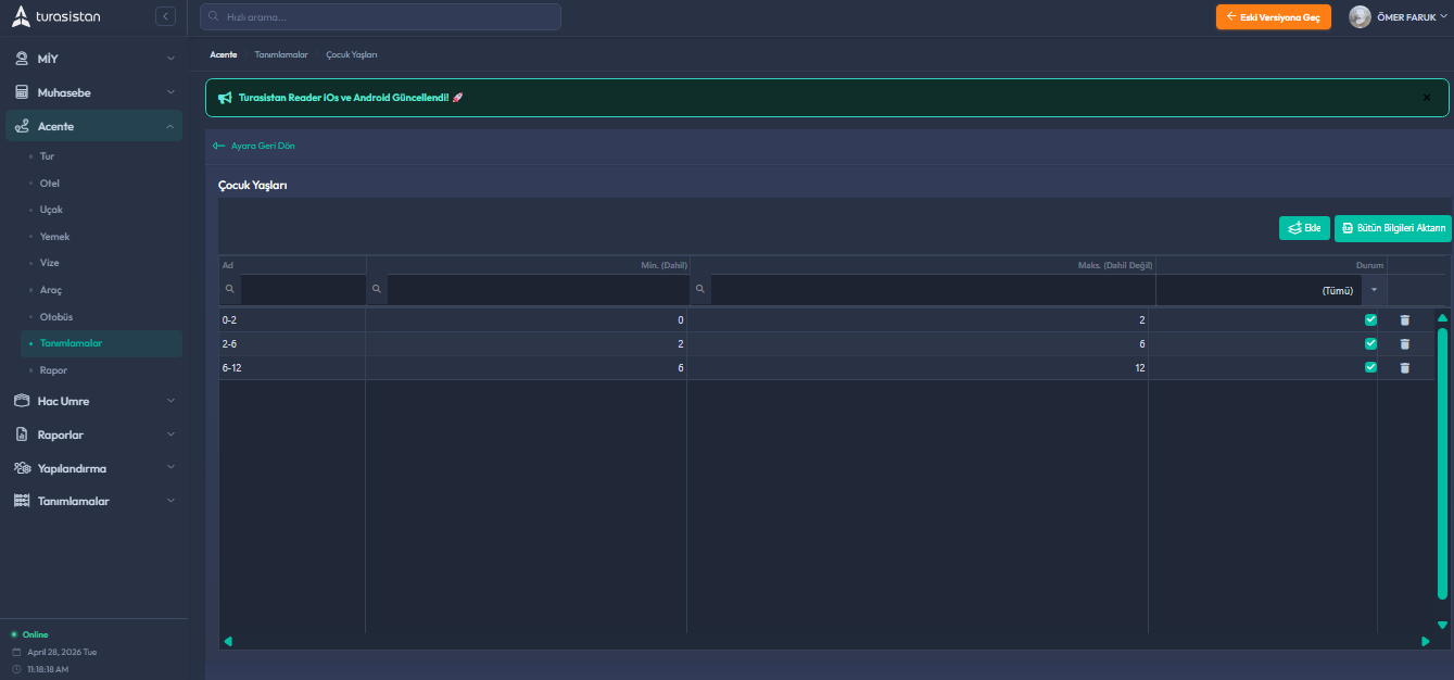 ACENTE/TANIMLAMALAR/ÇOCUK YAŞLARI