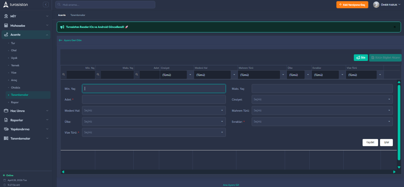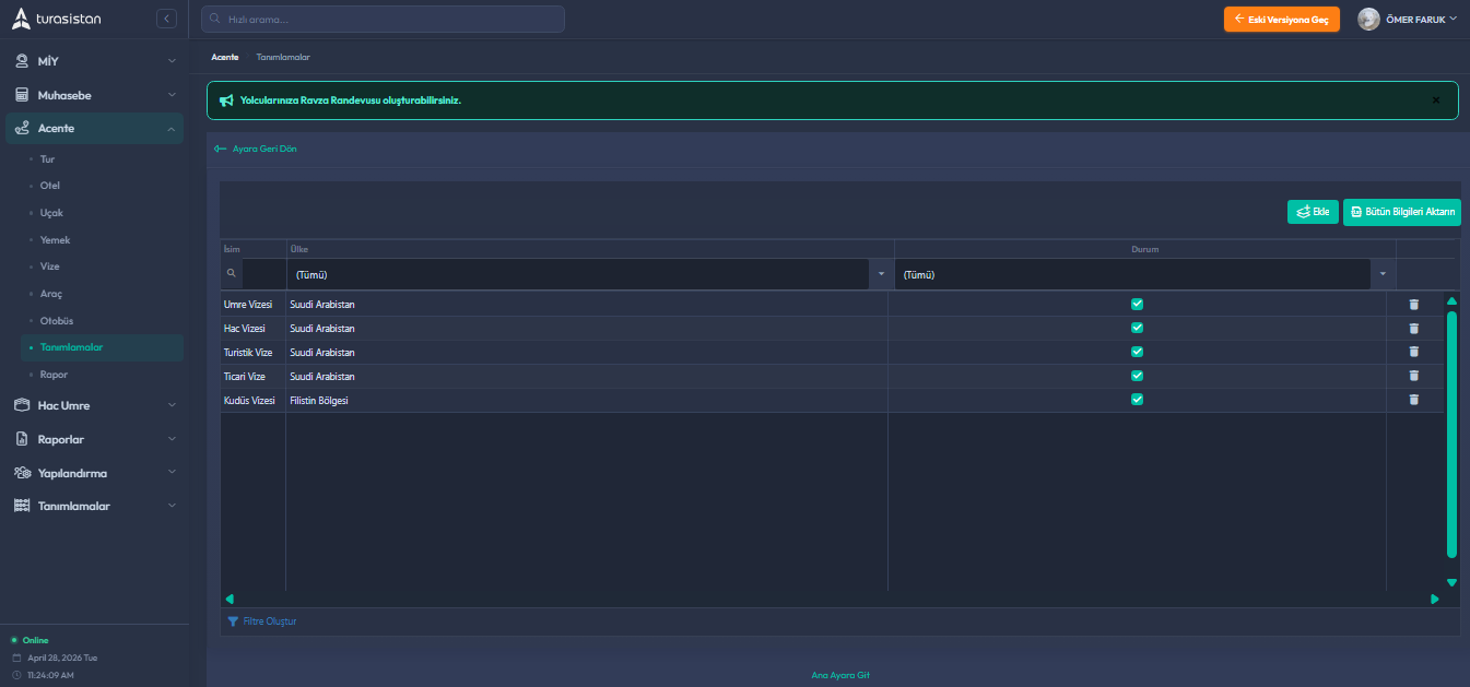 ACENTE/TANIMLAMALAR/VİZE TÜRLERİ