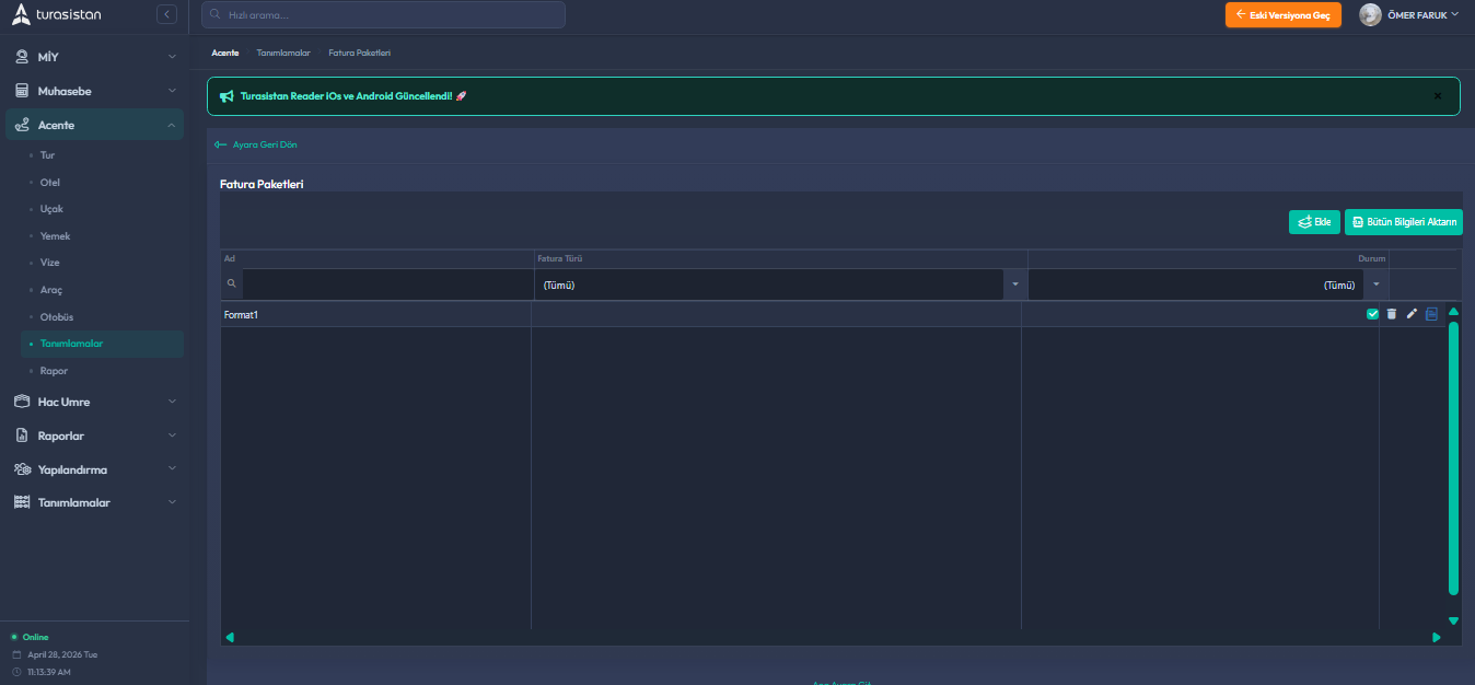 ACENTE/TANIMLAMALAR/FATURA PAKETLERİ