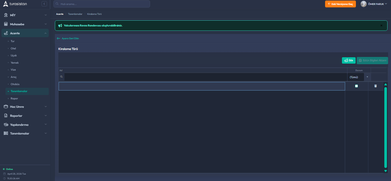 ACENTE/TANIMLAMALAR/KİRALAMA TÜRLERİ