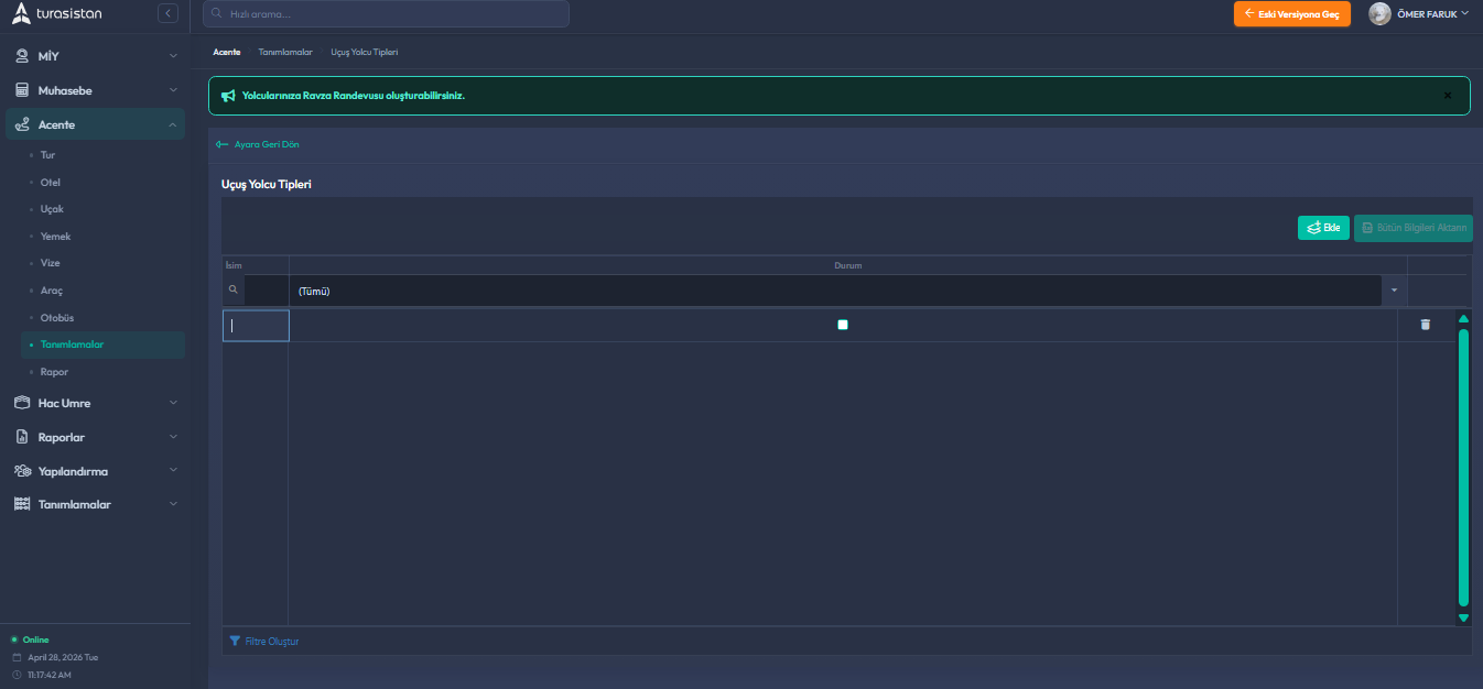 ACENTE/TANIMLAMALAR/UÇUŞ YOLCU TİPLERİ