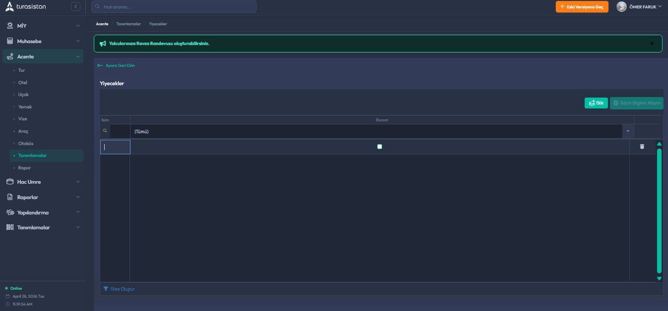 ACENTE/TANIMLAMALAR/YİYECEKLER