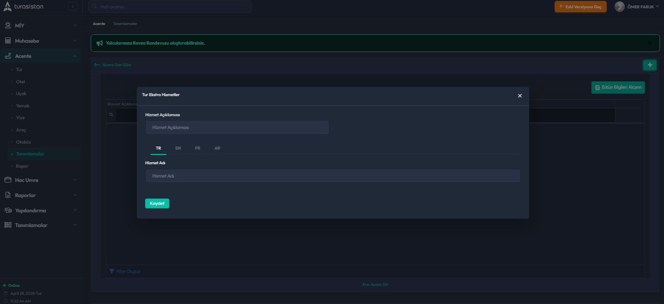 ACENTE/TANIMLAMALAR/TUR EKSTRA HİZMETLER