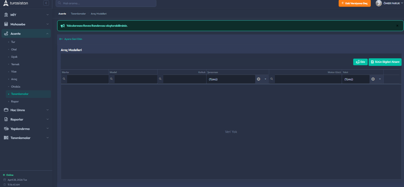 ACENTE/TANIMLAMALAR/ARAÇ MODELLERİ