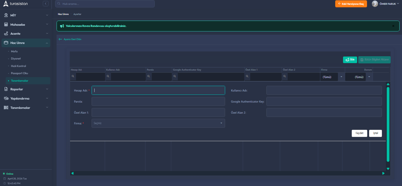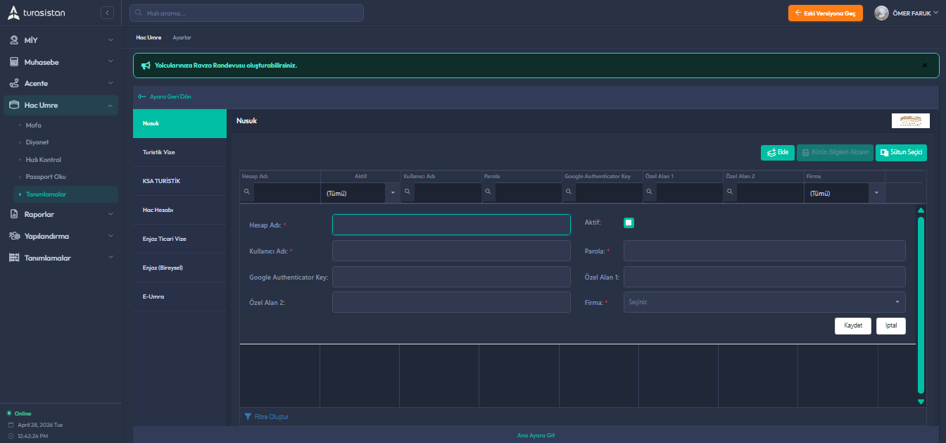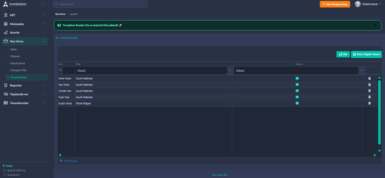 Tanımlamalar bölümünde, hac umre işlemleri ile ilgili genel bilgileri tanımlayabileceğiniz (vize türleri, vize hesapları, diyanet hesapları, evrak ve doküman gereksinimleri vb.) bölümler bulunmaktadır. Bu tanımlamalar bir sefere mahsus olmak üzere tanımlayabilir ve tüm operasyonlarda bu tanımlanan bilgileri kullanabilirsiniz.