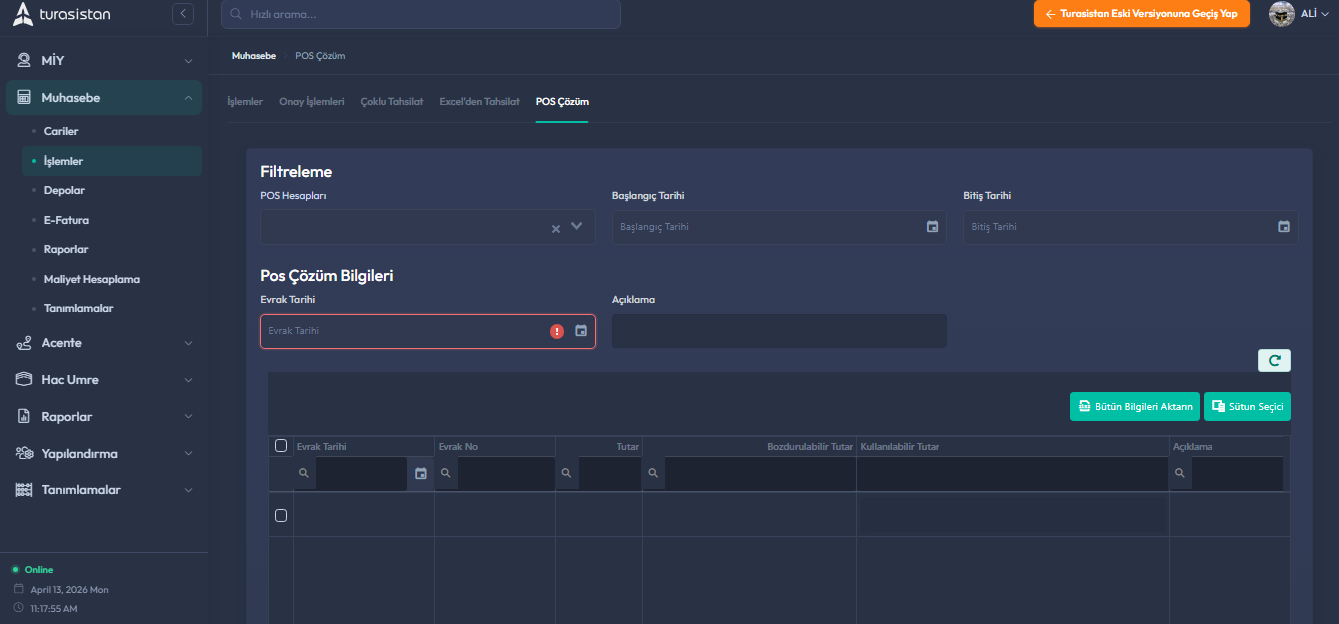 Pos çözüm bölümünde, kredi kartı ile ödemesi alınan yolcuların vadeleri gelmeden nakit paraya dönüştürme işlemi yapıldığında, bu ekrandan işlem sağlanmaktadır. İşlem yapılacak pos hesabını, evrak tarihini ve isteğe bağlı olarak açıklama girilmesi ile pos çözüm işlemi yapılmaktadır.