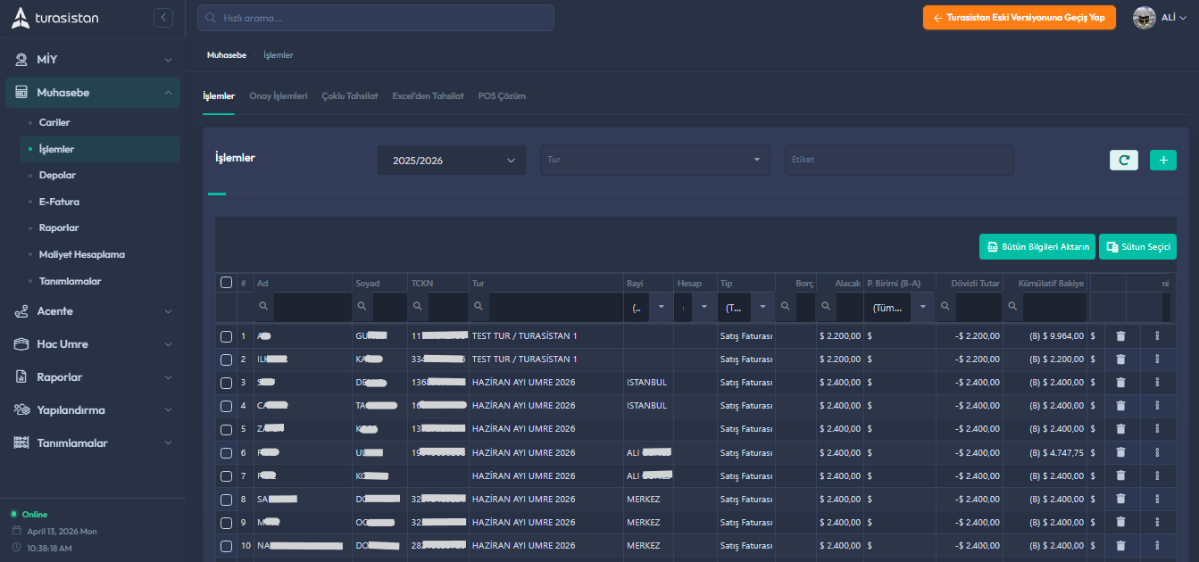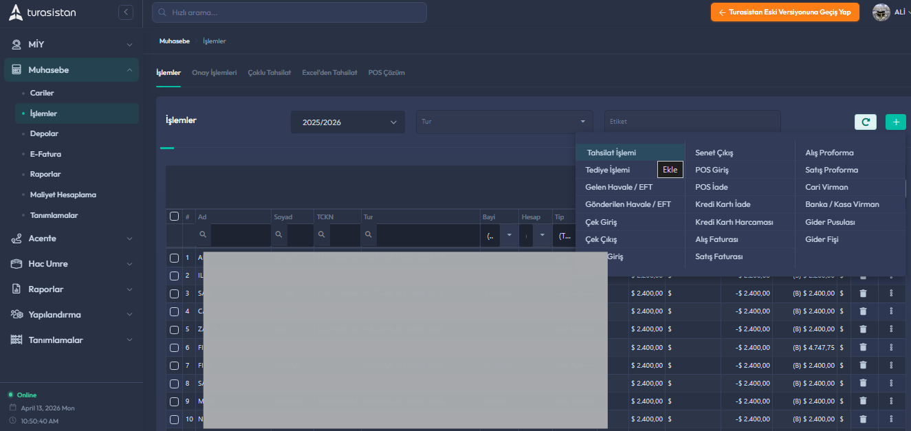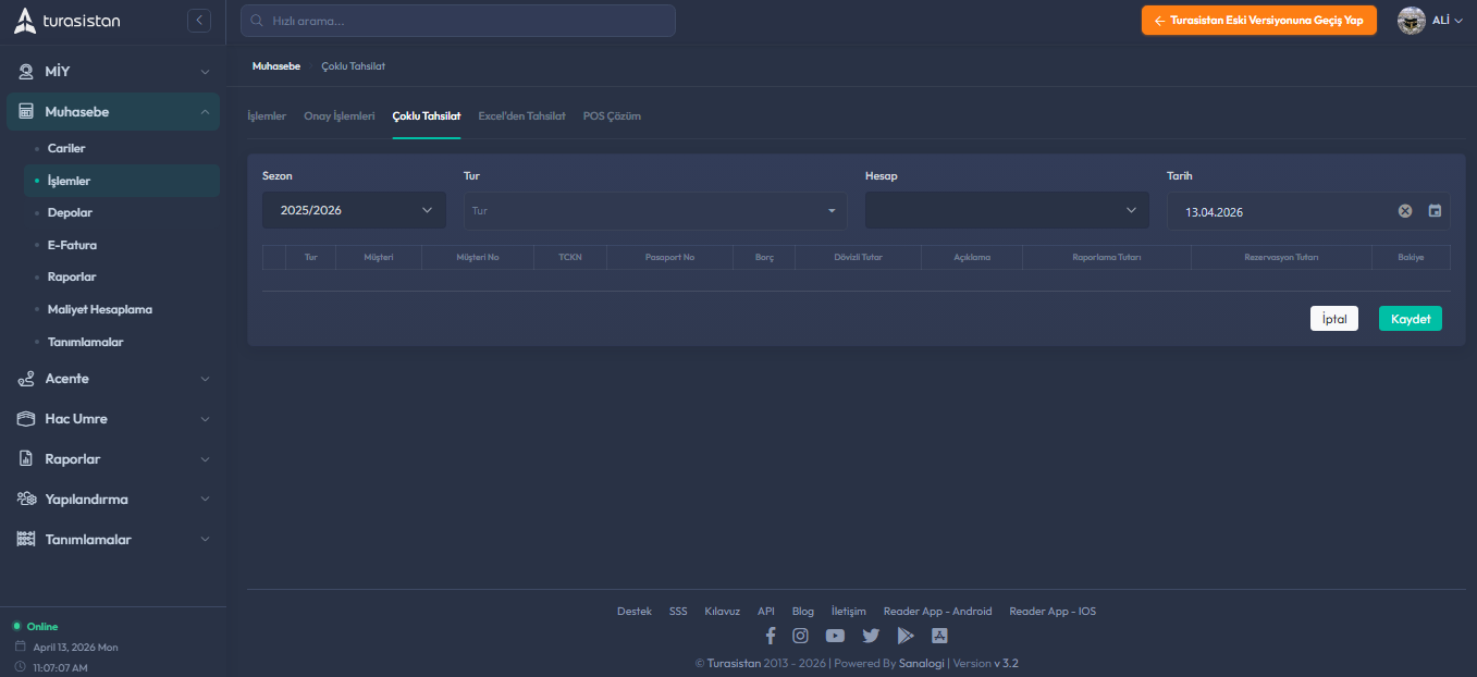 Çoklu tahsilat bölümünde, kasa veya banka işlemi seçilerek, bir turda gerçekleştirilen tahsilatlar tek bir ekran üzerinden toplu olarak girilebilir. Tur içerisinde, yolcuların ne kadar bakiyesi olduğu görülebilir ve bununla ilgili işlemler yapılabilir.