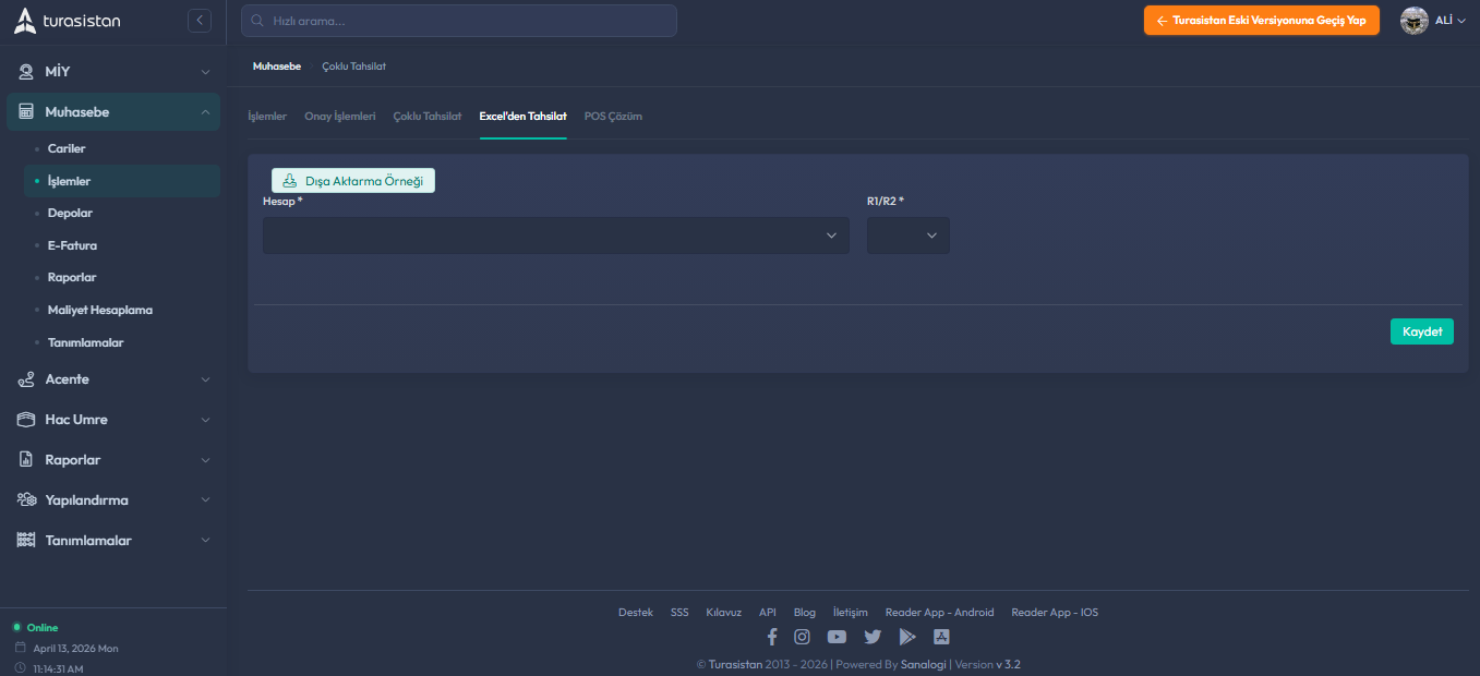MUHASEBE/İŞLEMLER/EXCEL’DEN TAHSİLAT